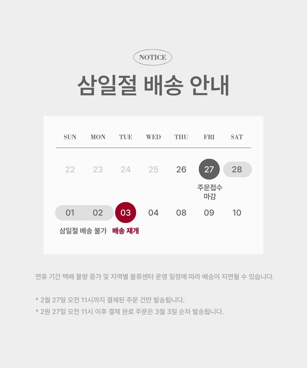 택배사의 사정에 따라 최소 2일 ~ 최대 5일, 도서/산간지역은 최대 7일 정도의 배송기간이 소요될 수 있습니다.(영업일 기준 / 공휴일 제외)